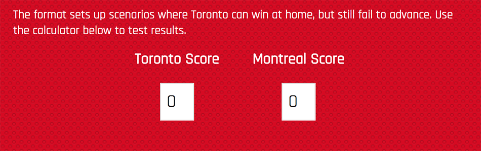 A tool to outline which team would advance between TFC and the Montreal Impact based on the away goals rule. No longer being maintained by The Canadian Press.