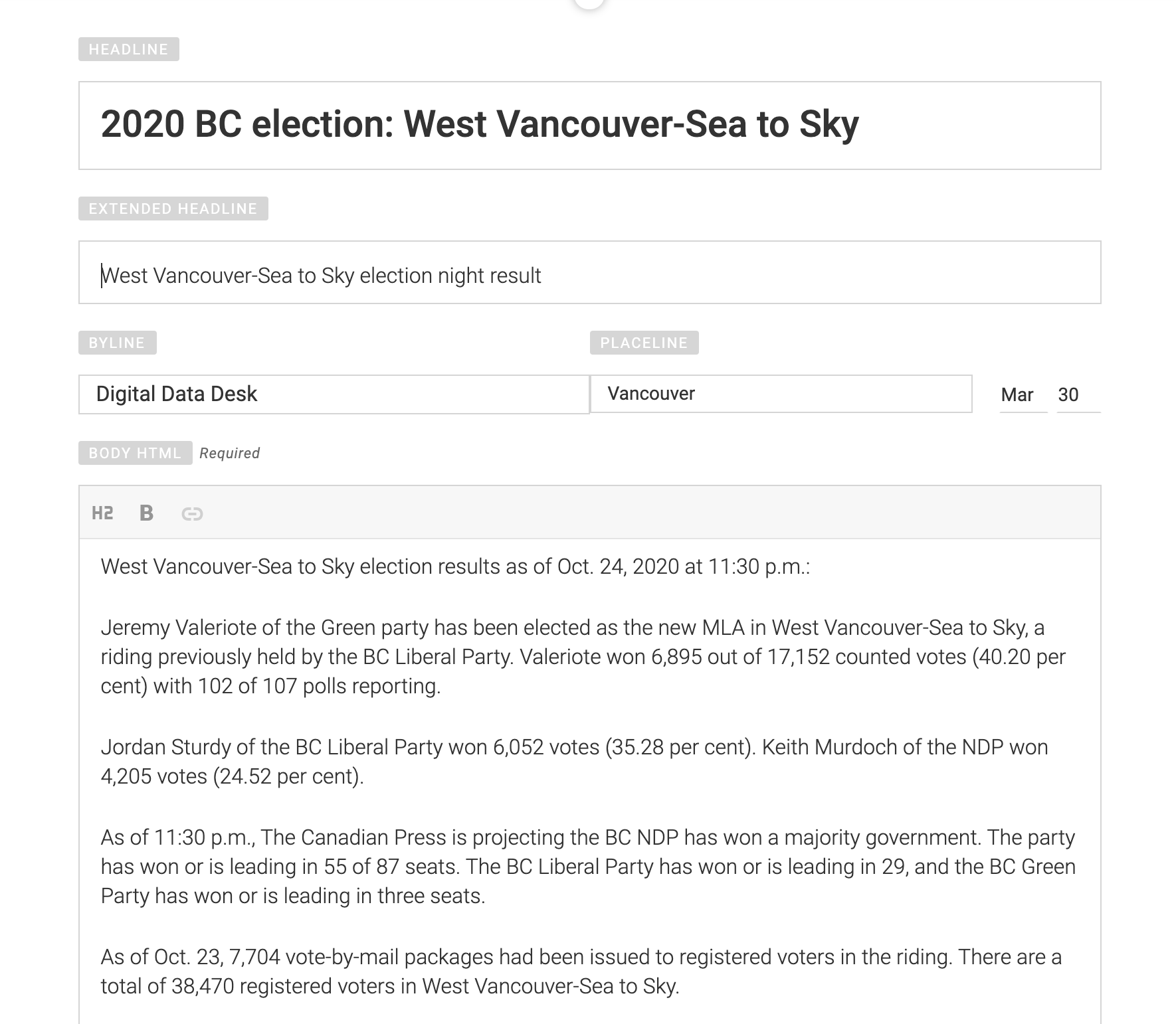 We created software to generate riding previews to go out to the newswire a few weeks before the British Columbia election in 2020. We automated a story for each of the 87 electoral districts, which included information from the previous election such as the person who won, the results for each candidate and the voter turnout.