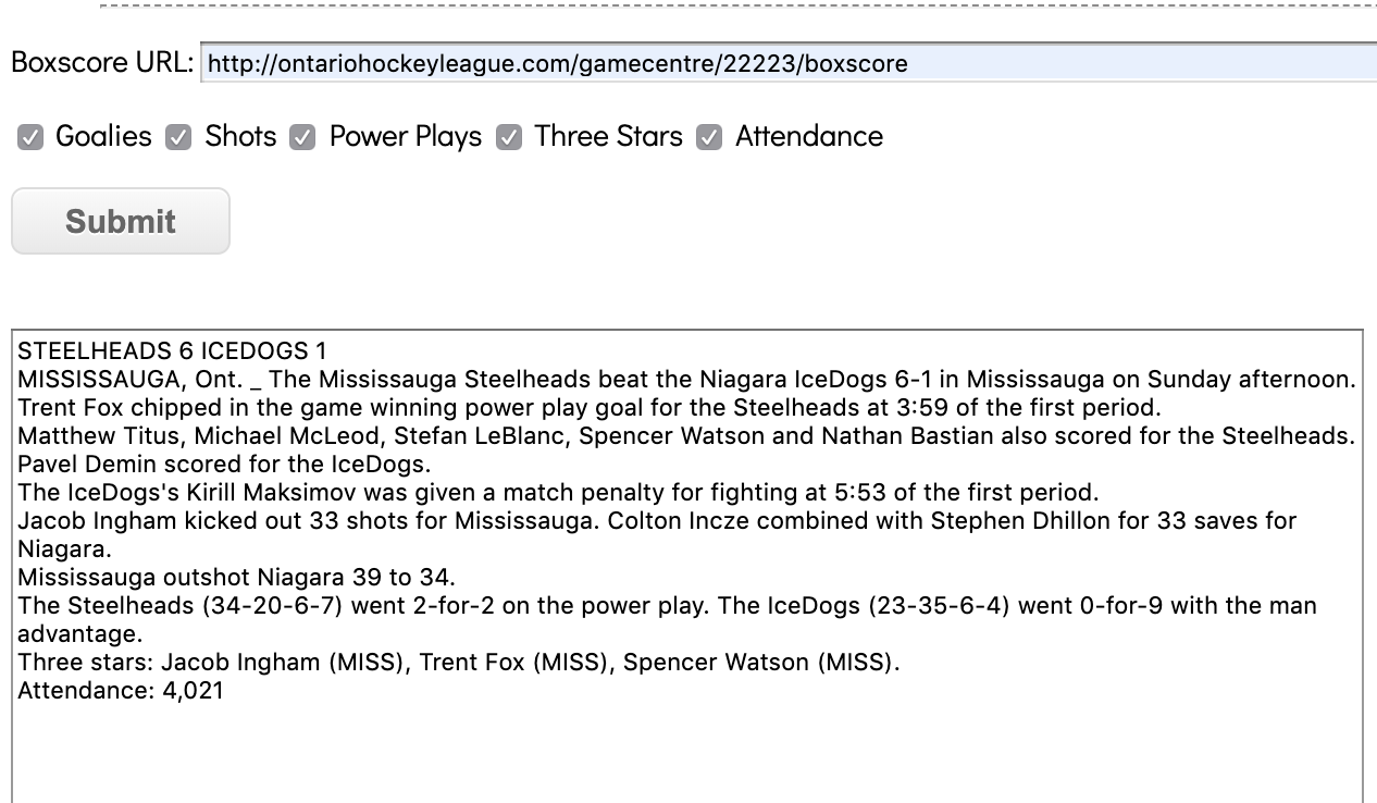 The sports desk used to write one or two sentence summaries of CHL games based on box score, but it was impossible to cover all games that happened in one night. The CHL story writer was created to allow CP sports reporters to write full game stories on more CHL games than before. The CHL bot does full stories without the quotes. A reporter simply takes the boxscore URL and puts it in the respective field in the tool. The tool then connects to a D3 API, takes the URL information, and connects to an unsecure API that is run by the CHL. For each game it pulls in the preview information and the box score and converts it into a story. There are tick boxes at the bottom of the CHL bot web page which contain elements of the stories that can be written. The story will be written with or without certain information depending on if a user checks or unchecks the boxes. Another feature of the CHL bot is that it generates variations of sentences so not every story is exactly the same.
