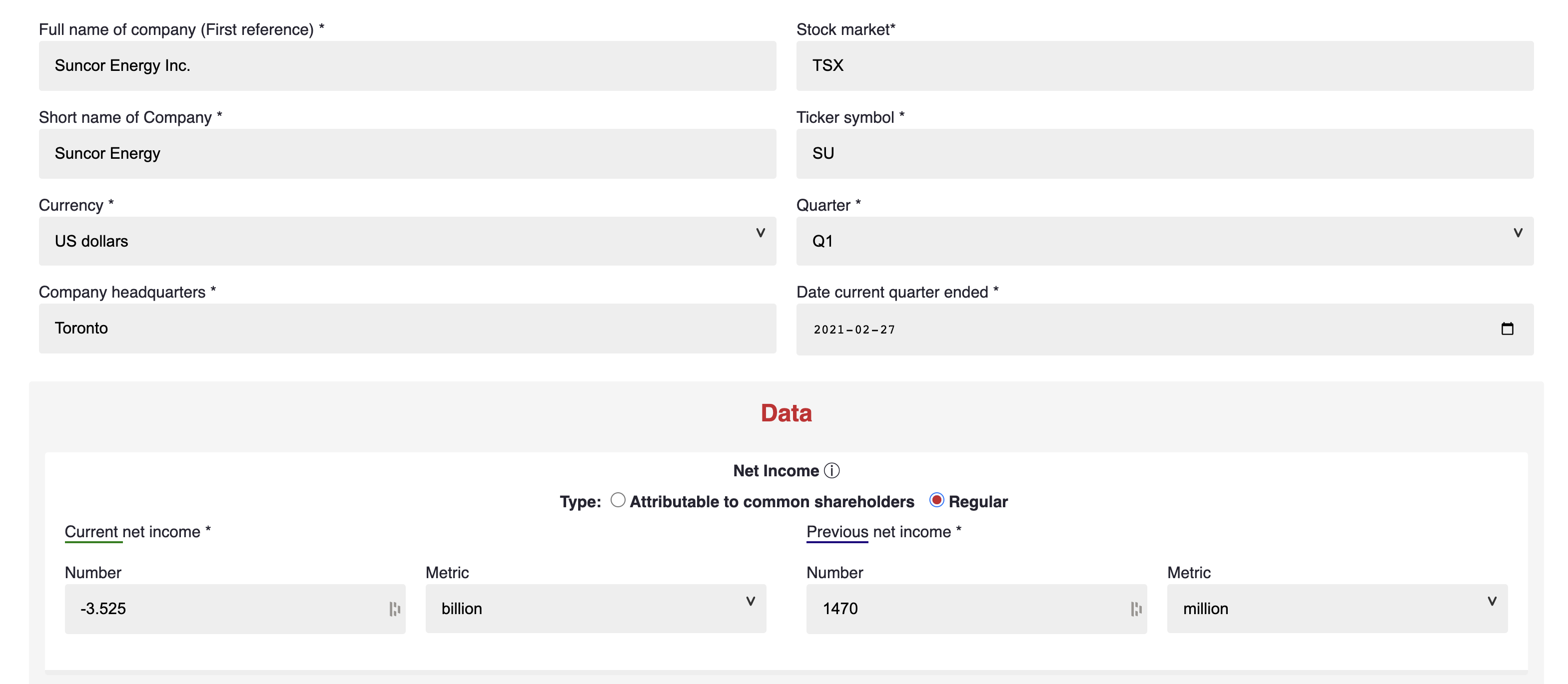 The Canadian Press Business Desk writes quickhit stories of companies quarterly earnings based on press releases. The reporters usually have an hour from the time the press release comes out, to the time the story has to go out to the wire. Then, they write another story about the company once more information comes out in the earnings calls or from sources. To save reporters time for writing the quick-hit stories, we created a tool that would automatically generate these stories. The business reporters now put in the key metrics in the respective boxes in the form, and a story will be automatically written based on the information provided.