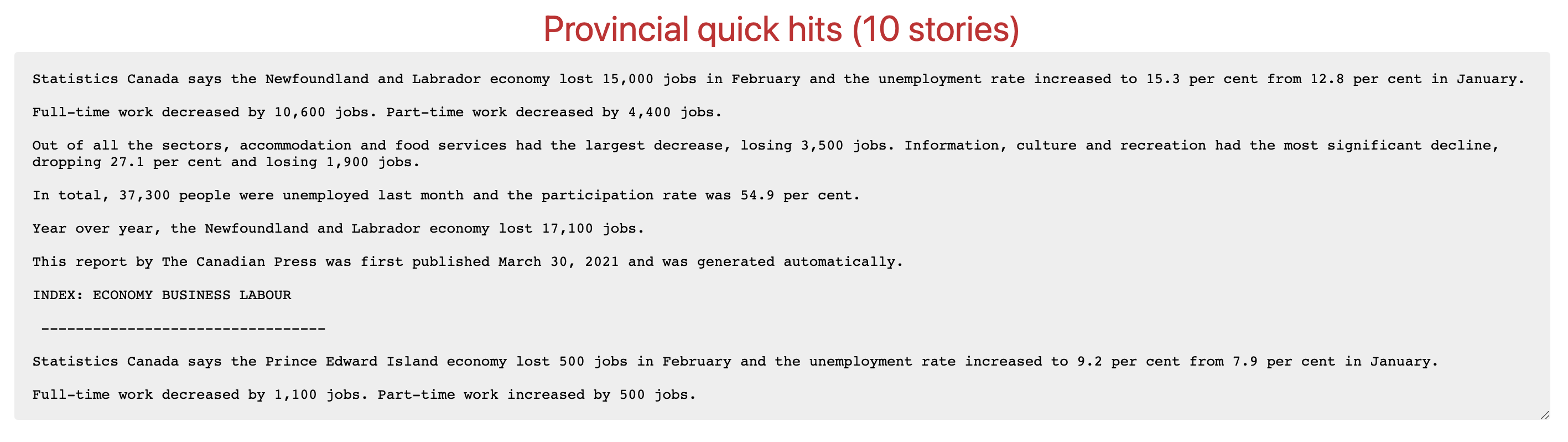 The tool generates a story with national employment statistics, a list of the provincial unemployment rates, and a list of the unemployment rates in large Canadian cities. It also writes a series of briefs, which writes short, quickhit style briefs for multiple levels of geography. In total, the tool will generate more than 130 stories: quick hits for Canada, each province, more than 30 major cities and all 65 economic regions, as well as a series for lists by geography and major industries.