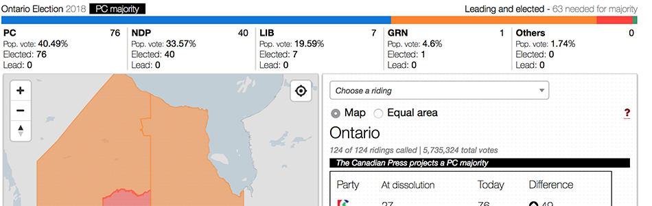 The 2017 Ontario provincial election map I made. Uses Mapboxgl for the base and has a d3js SVG overlay. The overlay is loaded as topojson. Data is read from an API I helped create. Includes poll-by-poll level results and equal area results. Used online on the Globe and Mail, Toronto Star, Global News and more. It was also used as the big board map on CityTV and Global News.