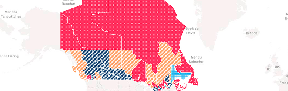The French version of the 2016 Canadian federal election map I made. Uses Mapbox (leaflet) for the base and has a d3js SVG overlay. Data is read from three JSON files.