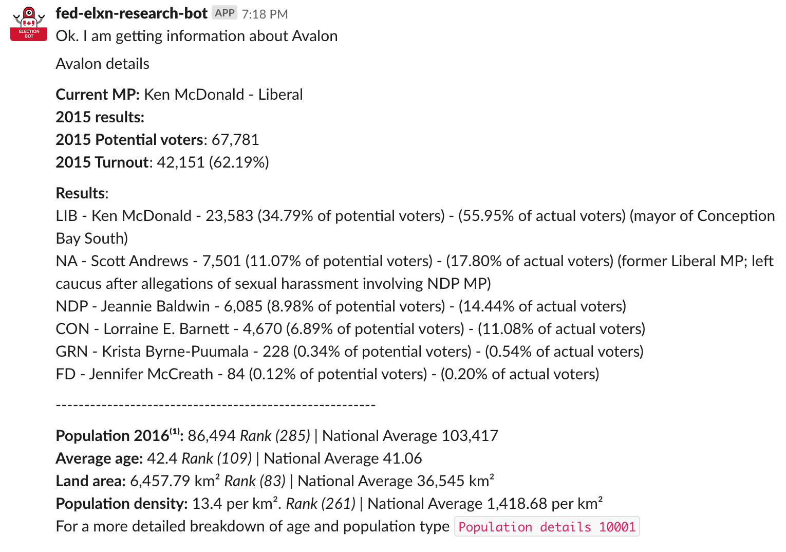 I created a Slack-based bot to help reporters with research for the 2019 Canadian Federal election. It uses a custom built API and combines the 2015 election results with all the data from the 2016 Canadian Census. It will give summaries and deep dives into data about ridings. It will also compare two ridings and write a 700 word summary about a riding. The link above is to a J-Source piece I wrote about the tool.